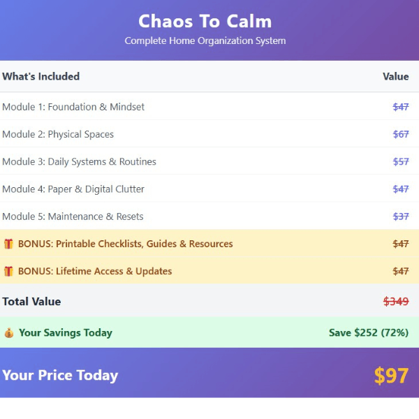 Yes! Most organizing advice focuses on the purge without teaching you the systems and routines needed to maintain it. This course teaches you how to build sustainable habits, not just do a one-time clean-out. You'll learn the "why" behind the clutter coming back—and how to prevent it.